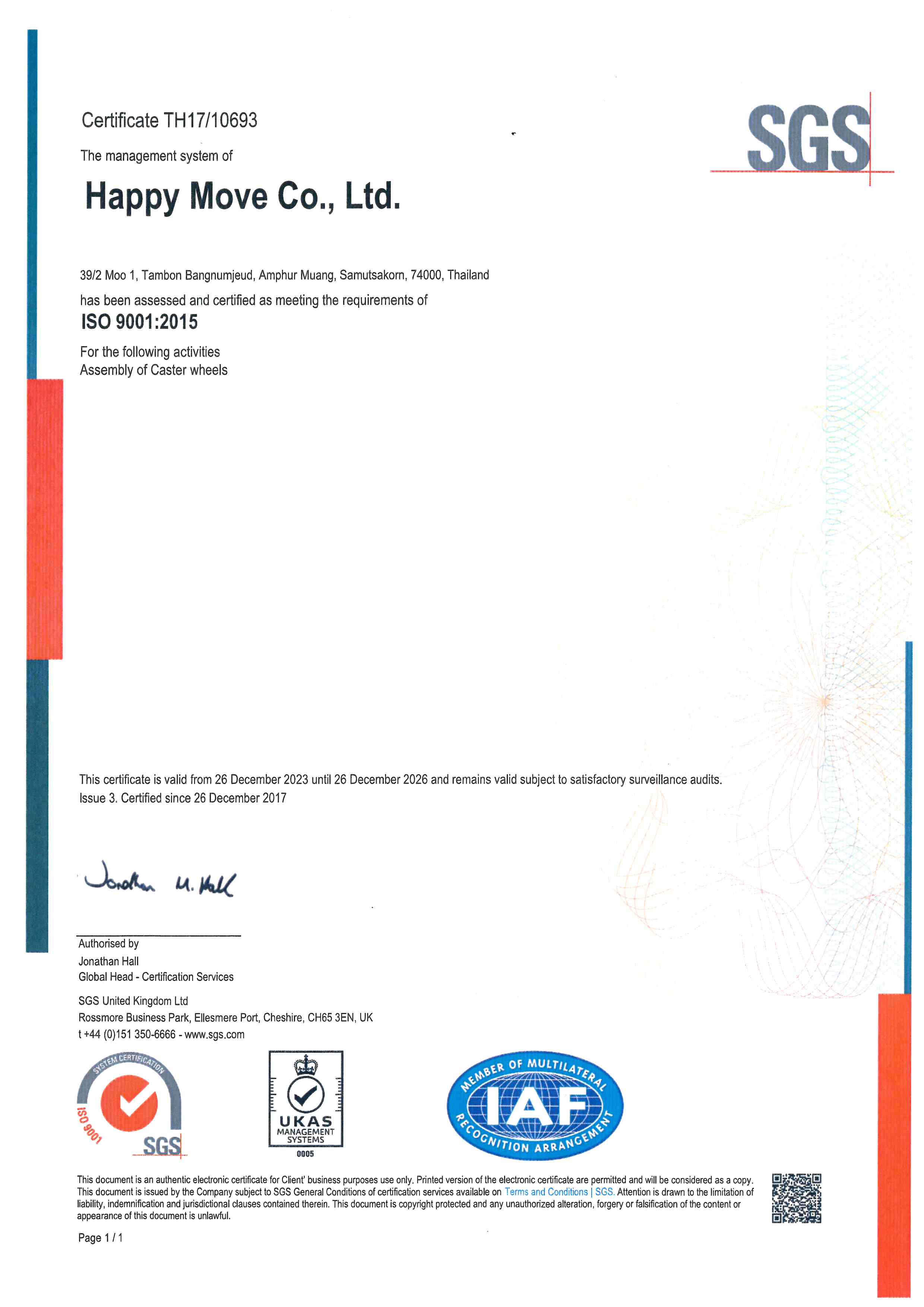 บริษัท แฮปปี้มูฟ จำกัด ยึดมั่นในการดำเนินธุรกิจด้วยความซื่อสัตย์ โปร่งใส และมุ่งเน้นคุณภาพ โดยนำหลักการของระบบบริหารคุณภาพ ISO 9001 มาเป็นกรอบแนวทางในการกำกับการทำงาน เพื่อให้สินค้าและบริการสามารถตอบสนองความต้องการของลูกค้า และเกิดการปรับปรุงอย่างต่อเนื่องอย่างยั่งยืน